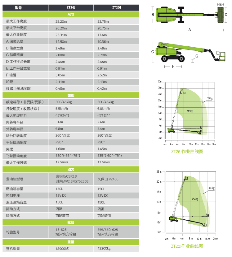 ZT20J直臂式高空作业平台,平台额定载荷为双载荷,分别达到300/454公斤,